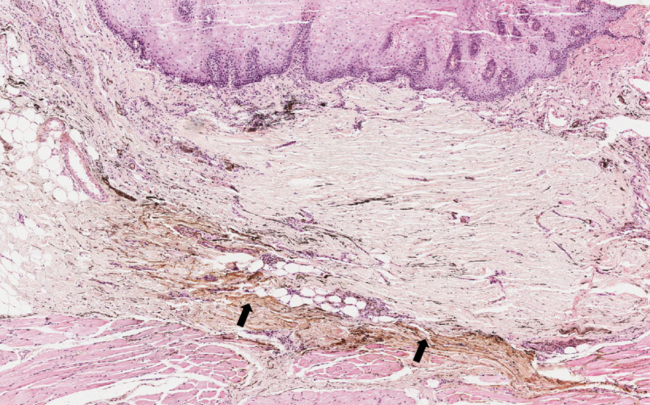 Fragmento de mucosa bucal revestida por epitélio estratificado pavimentoso ceratinizado, onde podemos observar no tecido conjuntivo fragmentos sólidos, escuros, acastanhados e dispersos entre as fibras caracterizando fragmentos de amalgama (setas). Os sais de prata do amálgama tem afinidade com as fibras reticulares, especialmente aquelas que circundam os nervos e vasos.