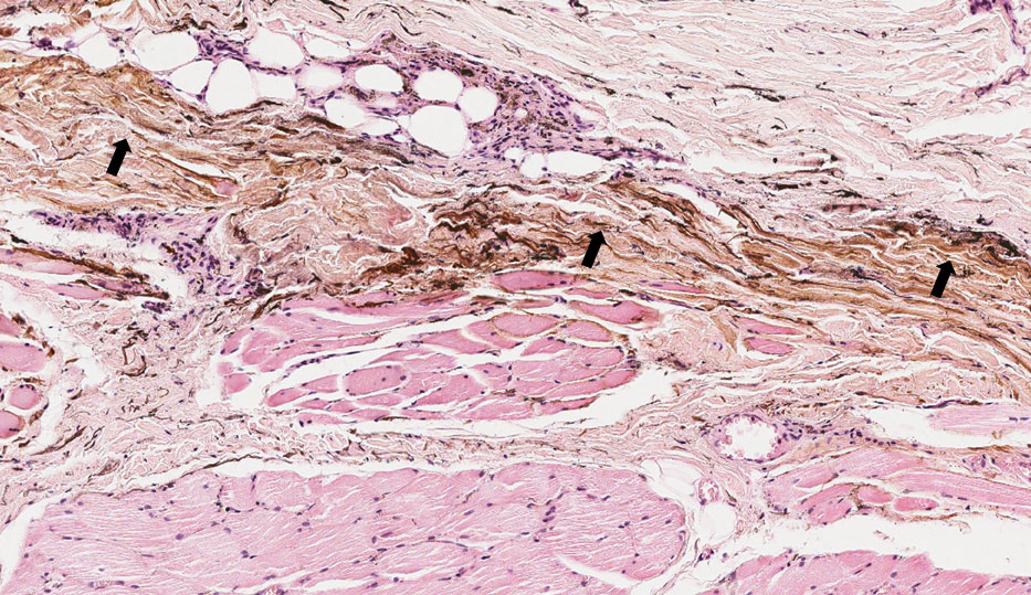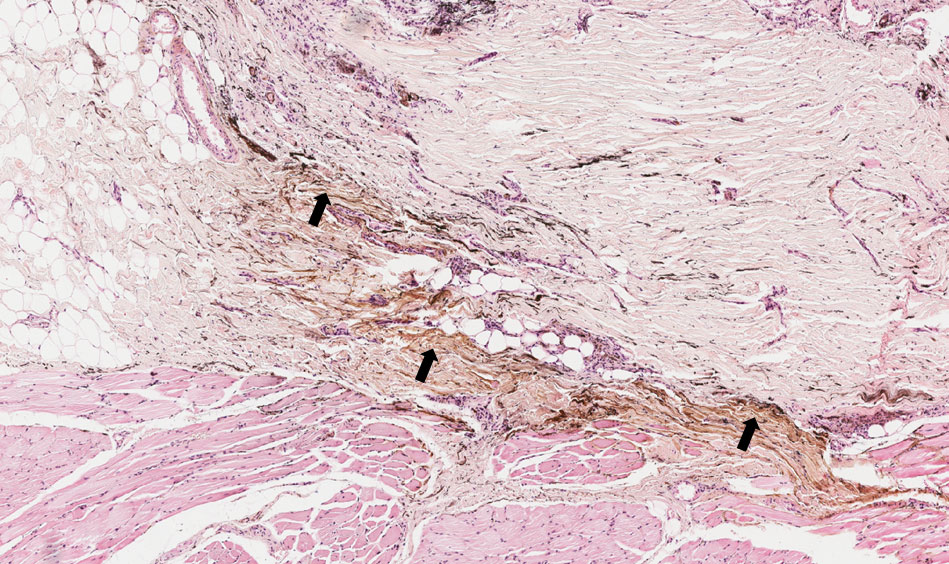 Retenção de fragmentos de pigmento exógeno – amálgama de forma dispersa e reticular, acompanhando as fibras colágenas do tecido conjuntivo (setas).