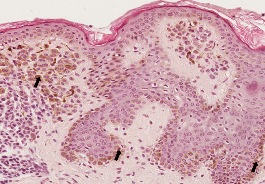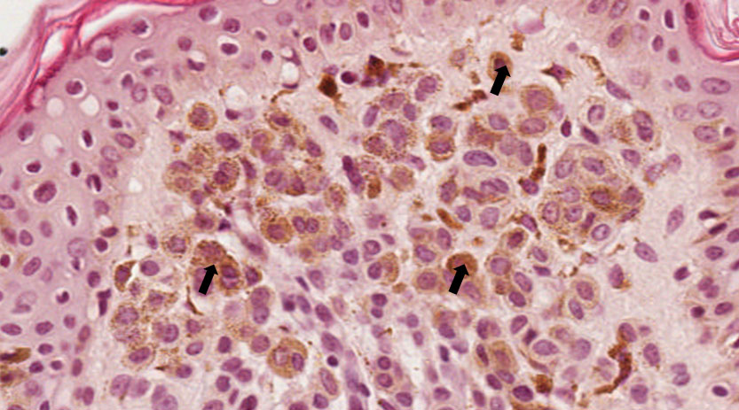 Célula melânica, pigmentada na porção superficial da lesão podendo estar presente no tecido epitelial ou no tecido conjuntivo.