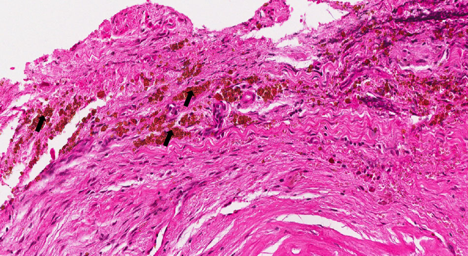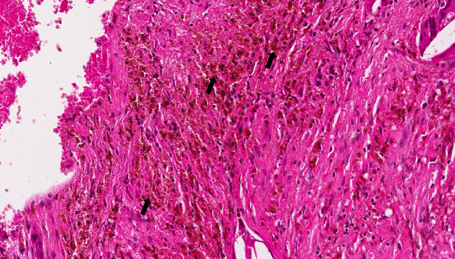 Observar hemácias aglomeradas no tecido conjuntivo e pigmento de coloração acastanhada e birrifringentes.