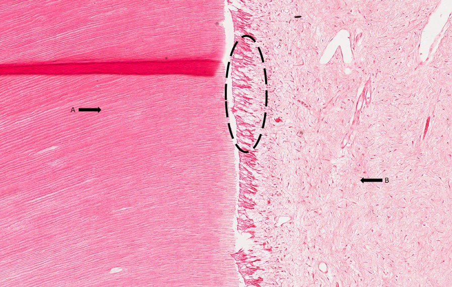Corte histológico de dente com rizogênese incompleta, onde podemos observar a dentina externamente (Seta A) e a polpa na porção central (Seta B). Nota-se aumento do número de vasos funcionantes (Setas pretas) sendo que, alguns estão preenchidos por hemácias caracterizando a hiperemia. Na margem podemos observar a camada odontoblástica descontínua, mostrando vacúolos que caracterizam a atrofia reticular (tracejado preto). A polpa se apresenta como um tecido conjuntivo fibroso pouco celularizado, outra característica da atrofia reticular.