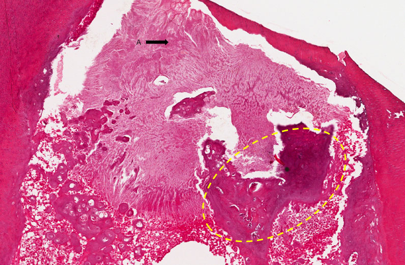 Corte histológico de dente decíduo, mostrando câmara pulpar aberta e recoberta parcialmente por material restaurador (capeamento) (Seta A). Nota-se pequena área de exposição pulpar. Abaixo do material de capeamento, observa-se formação de dentina terciária (osteodentina) (tracejado amarelo) e piócitos (supuração) (asteriscos amarelos) o qual se concentra na área mais superficial. No restante da polpa, observa-se intenso infiltrado inflamatório com predomínio de macrófagos espumosos. Na dentina da porção radicular, pode ser identificada reabsorção interna evidenciada pela ausência da camada de odontoblastos e de pré-dentina associada a presença de células clásticas na interface dentina-polpa, sendo estas as responsáveis pela reabsorção da dentina. Observamos também áreas de reabsorção externa e reabsorção externa compensada.