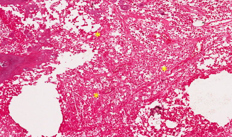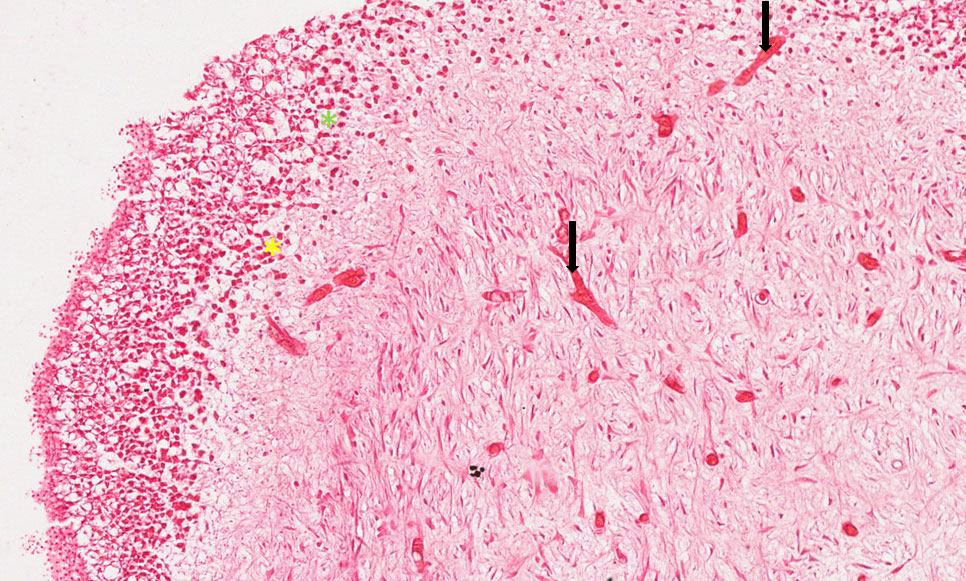 Observar o aumento de número de vasos na polpa (setas pretas), exsudato inflamatório com células inflamatórias especialmente linfócitos (asterisco amarelo), plasmócitos (asterisco verde) e macrófagos.