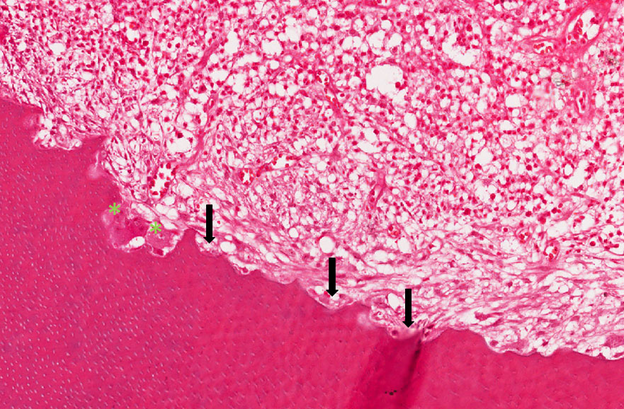 Observar a cavidade aberta (área de ulceração) material restaurador, formação de dentina terciária, área de supuração e intenso infiltrado inflamatório com predomínio de macrófagos e linfócitos. Em algumas áreas observa-se reabsorção da raiz com presença de clastos (asteriscos verdes) em contato com a dentina radicular (lacunas de Howship – setas pretas) tecido pulpar inflamado.
