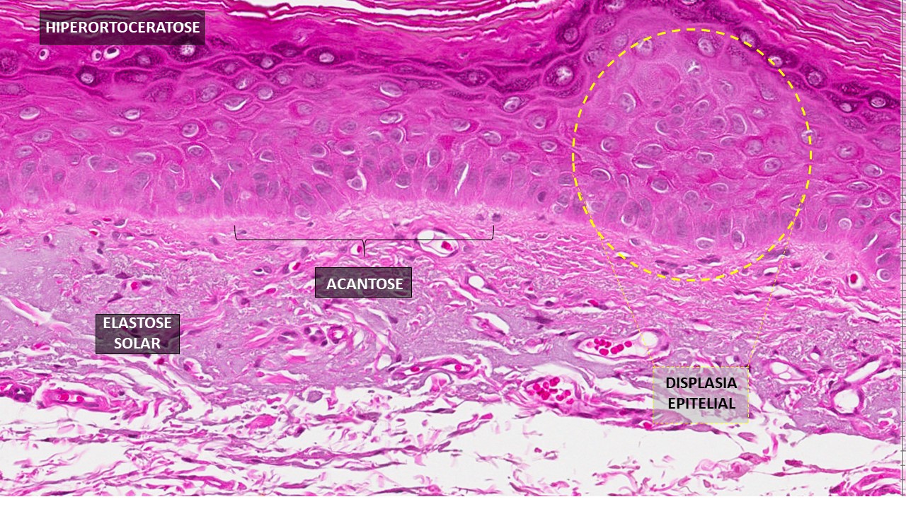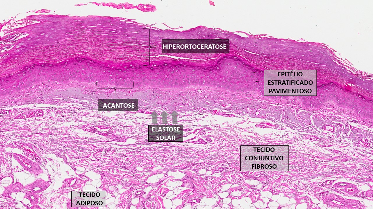 É caracterizada por um epitélio escamoso estratificado atrófico, com uma hiperceratose, grânulos de querato hialina, acantose (espessura aumentada da camada granulosa), pode aparecer displasia epitelial, área de elastose solar (modificação no conjuntivo fibroso, aspecto mais basófilo e amorfo).