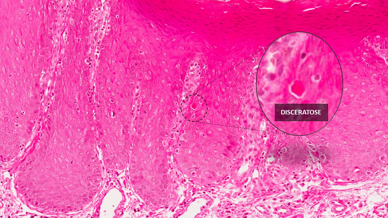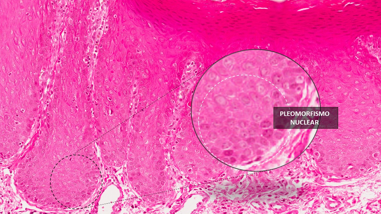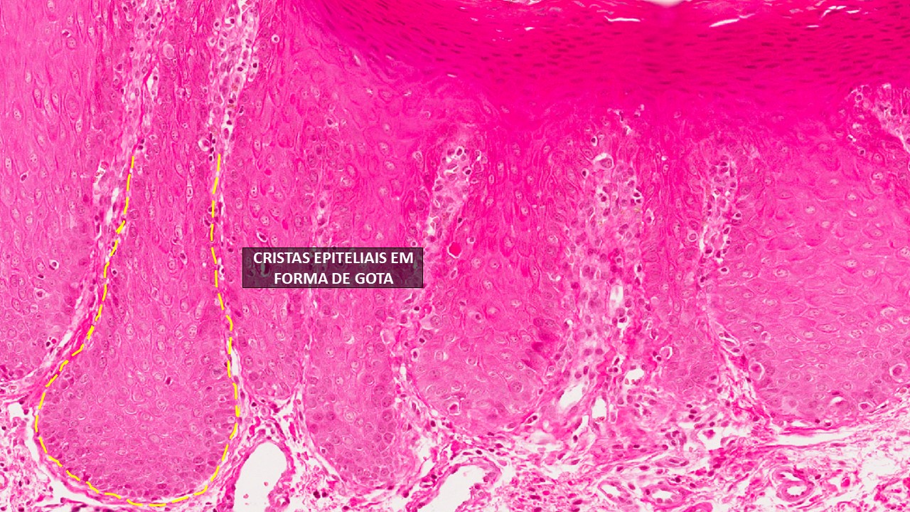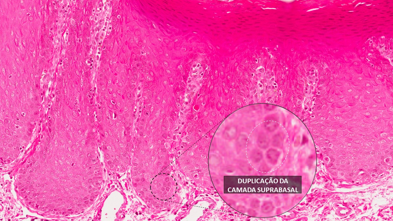 Camada de ceratina do epitélio de superfície com aumento da espessura (hiperceratose). Projeções epiteliais em forma de gotas, duplicação da camada basal do epitélio, alteração na estratificação epitelial. Observa-se células hipercromáticas (com núcleos mais corados pela hematoxilina), pleomorfismo celular e nuclear, disceratose (ceratinização individual e prematura de células), atividade mitótica aumentada (número excessivo de mitoses) e figuras de mitoses anormais. O tecido conjuntivo apresenta células inflamatórias (linfócitos e plasmócitos).