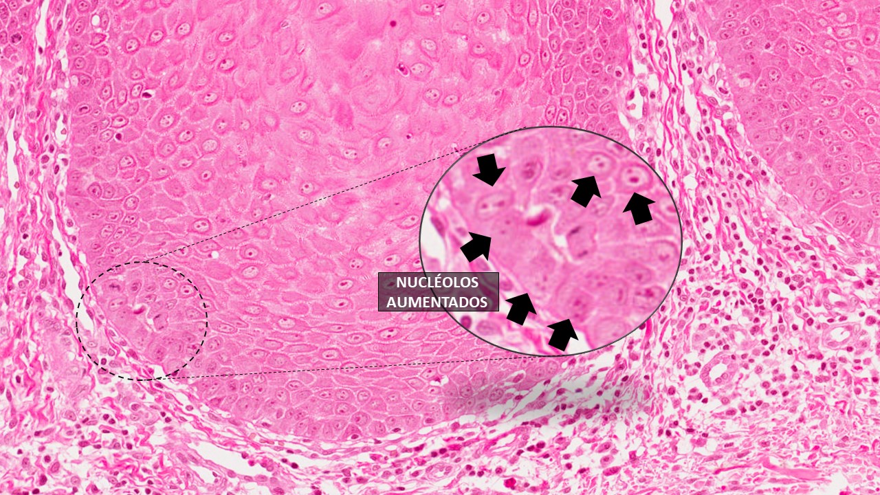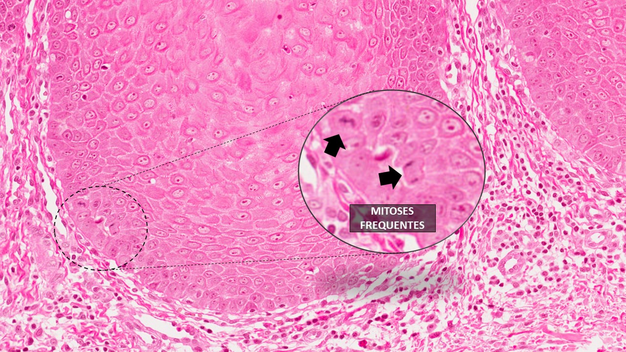 - Presença de células epiteliais com hipercromatismo, pleomorfismo, disceratose e que as mitoses são frequentes.